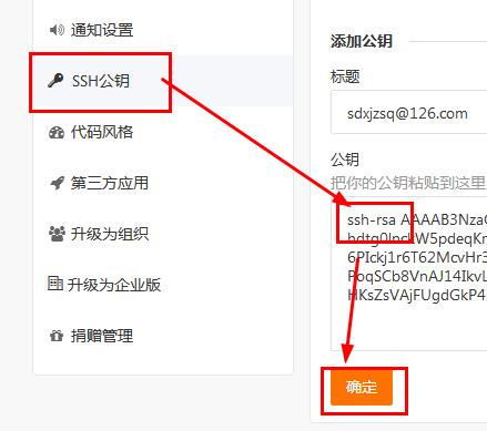 将刚复制的内容粘贴到公钥那里,标题会自动填上你的邮箱,也可以修改,最后点击确认即可,github和coding大同小异。